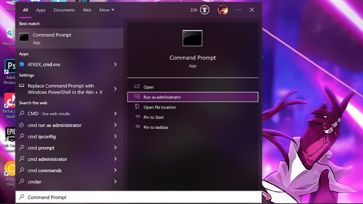 - ΑνοιχτόΑρχή> αναζήτηση γιαΠροτροπή εντολών> Επιλέξτε τοΕκτελέστε ως διαχειριστήςεπιλογή.