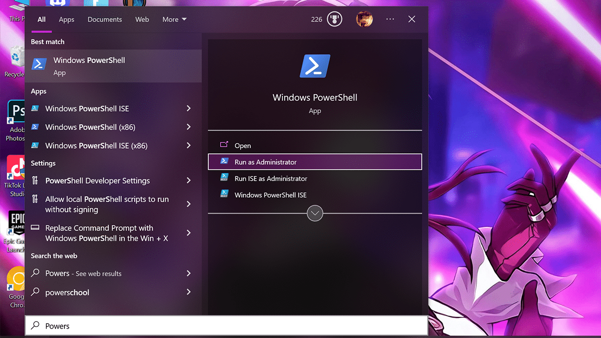 - ΑνοιχτόΑρχή> αναζήτηση γιαPowerShell> Επιλέξτε τοΕκτελέστε ως διαχειριστήςεπιλογή.