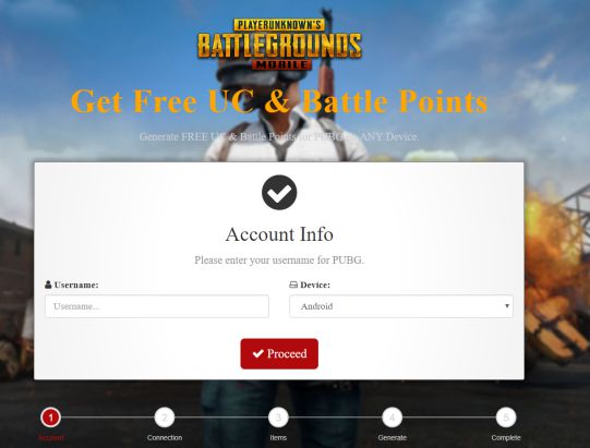 - Οι δωρεάν γεννήτριες UC συνήθως απαιτούν το δικό σαςΌνομα χρήστη και πλατφόρμα συσκευήςτου smartphone σας πριν προσπαθήσετε να "στέλνω"Το UC ή BP.Πόσο UC ή BP θέλετε να φορτώσετε στο λογαριασμό σας "δωρεάν". Στη συνέχεια, υπάρχει το Catch: Ως τελικό βήμα για να στείλετε το δωρεάν UC ή BP στον λογαριασμό σας για κινητά PUBG, θα σας ζητήσειΕπαληθεύστε εάν είστε άνθρωπος χρησιμοποιώντας μια έρευνα.