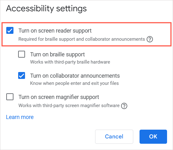 - Επιλέξτε το πλαίσιο στην κορυφή γιαΕνεργοποιήστε την υποστήριξη του αναγνώστη οθόνης. Ελέγξτε προαιρετικά τα πρόσθετα πλαίσια ανά προτίμησή σας.