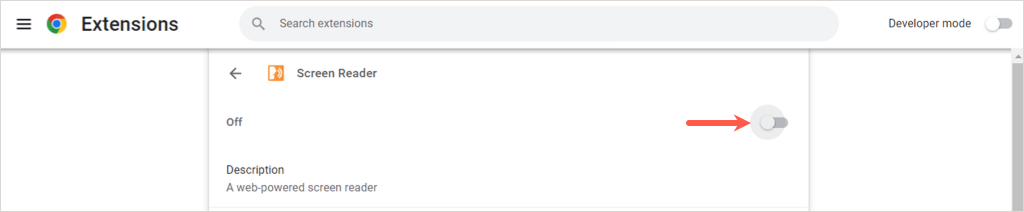 Για να απενεργοποιήσετε τον αναγνώστη οθόνης, επιλέξτε το κουμπί της γραμμής εργαλείων και επιλέξτεΔιαχείριση επέκτασης. Στη συνέχεια, απενεργοποιήστε την εναλλαγή.