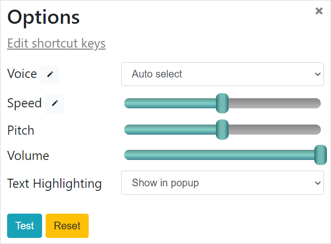 Για να ρυθμίσετε τις ρυθμίσεις του πρόσθετου, επιλέξτε τογρανάζιεικόνισμα. Στη συνέχεια, μπορείτε να αλλάξετε τη φωνή, την ταχύτητα, το βήμα, τον όγκο και την επισήμανση κειμένου.