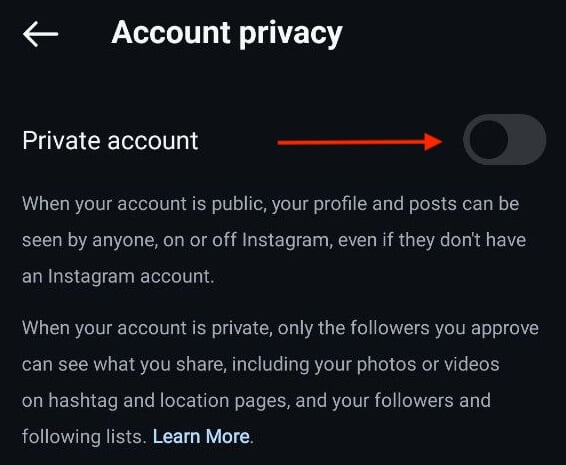- Εναλλαγή του διακόπτη δίπλα στοΙδιωτικός λογαριασμόςΓια να το ενεργοποιήσετε και να κάνετε το προφίλ σας ιδιωτικό.