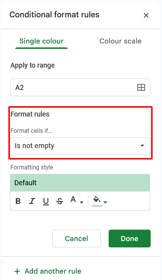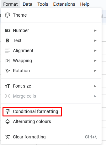 - ΕπιλέγωΥπό όρους μορφοποίησηαπό το αναπτυσσόμενο μενού. Το μενού μορφοποίησης υπό όρους θα ανοίξει στη δεξιά πλευρά του φύλλου Google.