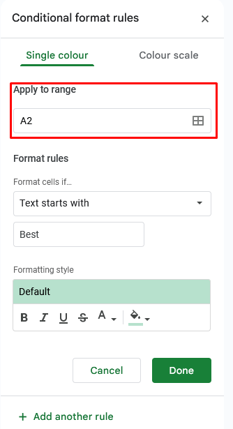 - Εάν θέλετε να εφαρμόσετε τη μορφοποίηση υπό όρους σε πολλαπλά κύτταρα που περιέχουν την ίδια λέξη, θα πρέπει να εισαγάγετε το εύρος στο οποίο θα εφαρμοστεί η μορφοποίηση. Κάντε κλικ στοΕφαρμόστε στο εύροςκουτί.