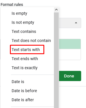 Μπορείτε επίσης να επισημάνετε όλα τα κύτταρα που τελειώνουν με μια συγκεκριμένη λέξη. Τα βήματα είναι σχεδόν τα ίδια. Ωστόσο, όταν φτάσετε στο σημείο όπου πρέπει να επιλέξετεΚανόνες μορφής, Θα επιλέξειςΤο κείμενο τελειώνει μεαπό το αναπτυσσόμενο μενού.