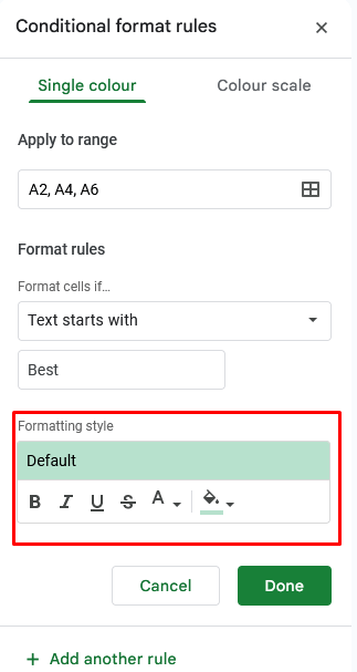 - ΣτοΣτυλ μορφοποίησηςΤμήμα, μπορείτε να επιλέξετε το χρώμα κειμένου και φόντου που θέλετε να προστεθούν στο κείμενο ή σε ολόκληρο το κύτταρο και τις επιλογές μορφοποίησης κειμένου, όπως BOLD, ITALIC και Strikethrough.