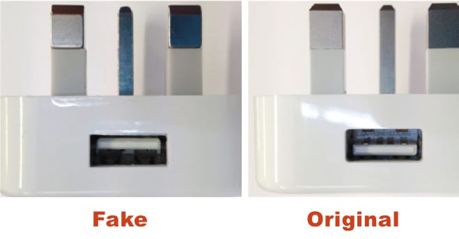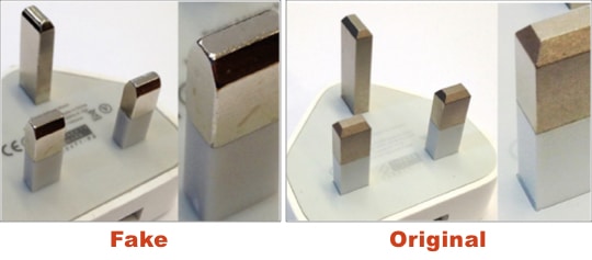 Ένα γνήσιο άκρο σύνδεσης USB του φορτιστή Apple έχει τραπεζοειδείς αλληλοσυνδέσεις στο κέλυφος. Αυτές οι αλληλοσυνδέσεις είναι εξίσου σε απόσταση από τις άκρες. Οι πλαστοί φορτιστές έχουν αλληλοσυνδέσεις δεξιάς γωνίας που είναι ασυνεπώς τοποθετημένες.