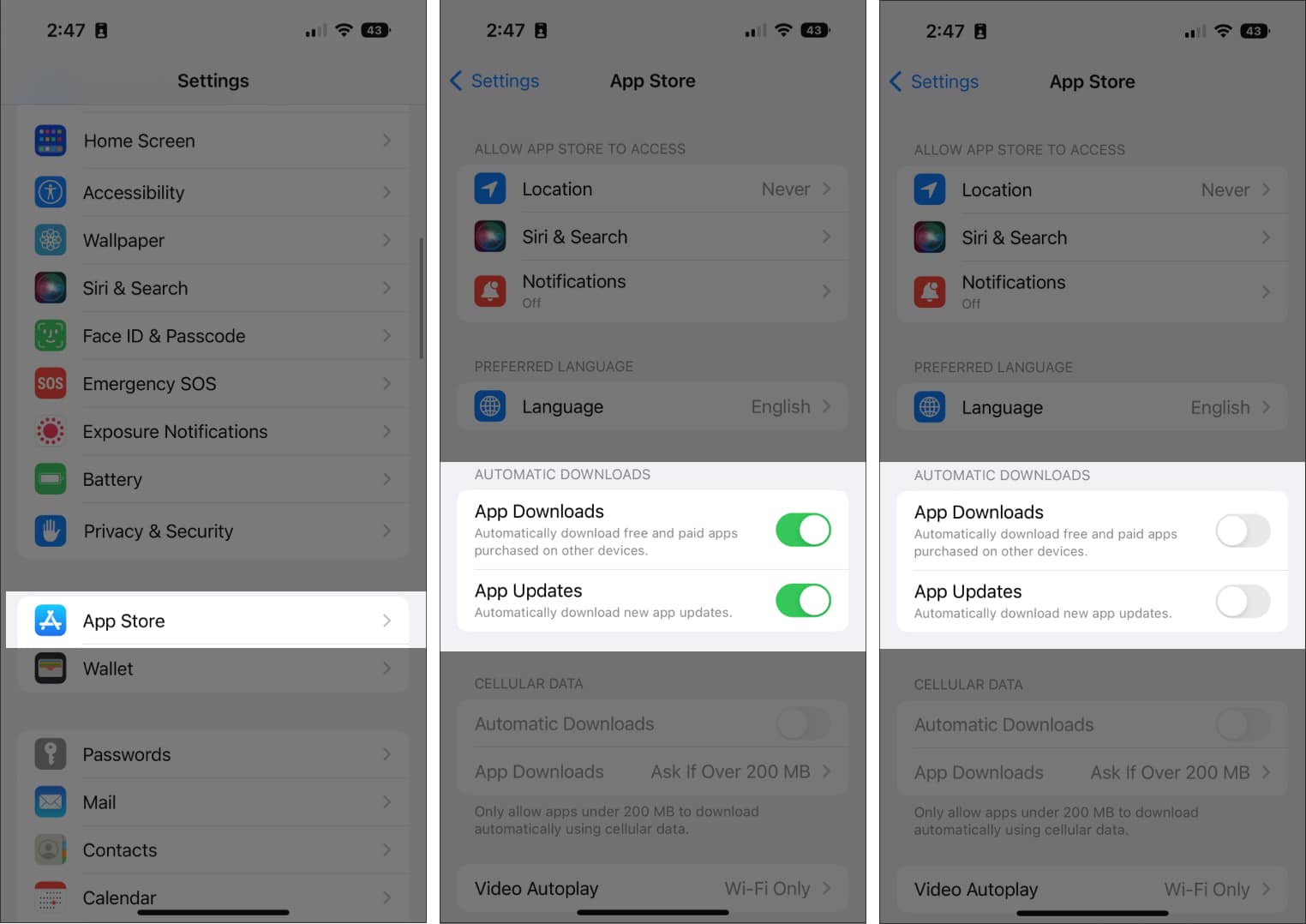Οι αυτόματες ενημερώσεις εφαρμογών και οι λήψεις μπορούν να χρησιμοποιήσουν πολλά κυτταρικά δεδομένα. Απενεργοποιήστε αυτήν τη λειτουργία πηγαίνονταςΡυθμίσεις→Κατάστημα εφαρμογών, στη συνέχεια εναλλαγήΕνημερώσεις λήψης και εφαρμογών εφαρμογώνμακριά από. Επιστρέψτε στις ρυθμίσεις και κάνετε το ίδιο για μουσική, βιβλία και podcasts, αν χρησιμοποιείτε επίσης αυτές τις υπηρεσίες.