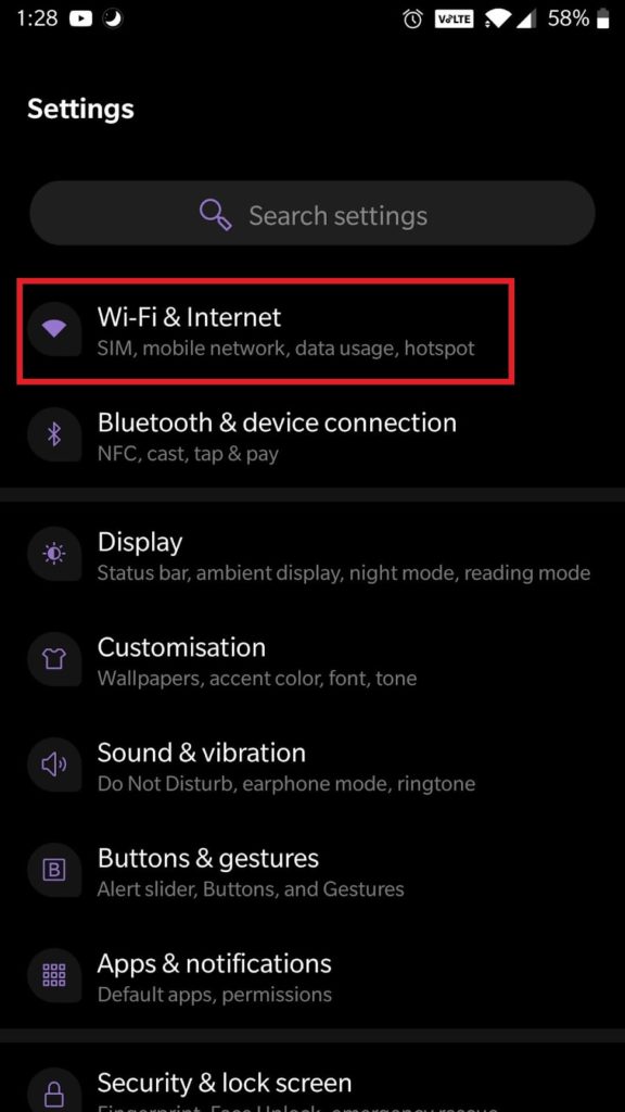 Για να αποκτήσετε πρόσβαση στην προτιμώμενη ρύθμιση τύπου δικτύου στη συσκευή σας Android, μεταβείτε στη συσκευή σαςΡυθμίσεις,Στη συνέχεια, επιλέξτεWi-Fi & Internet.