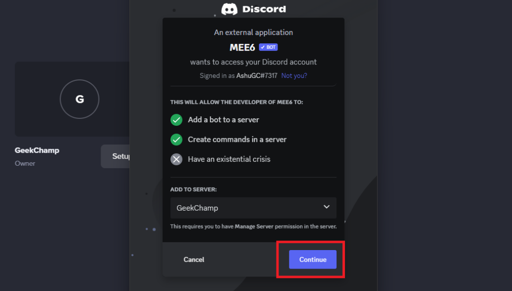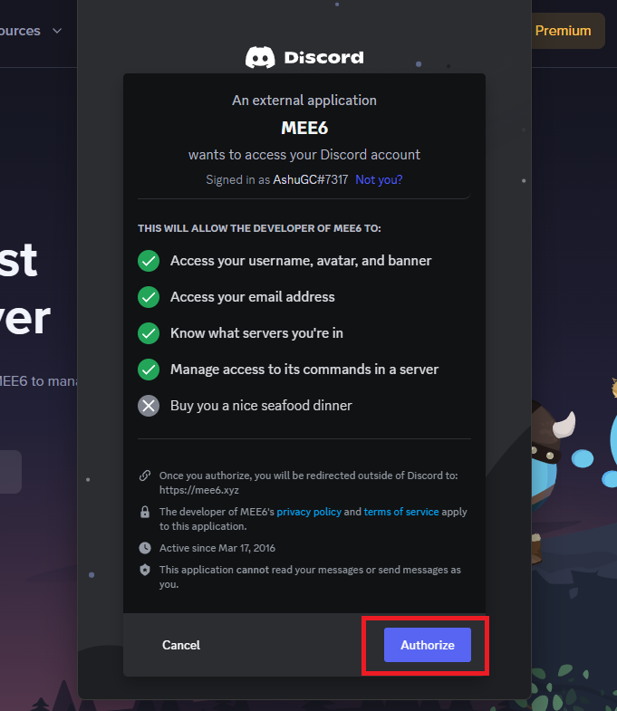 3.Εξουσιοδοτήστε το bot να αποκτήσετε πρόσβαση στον λογαριασμό σας Discord.