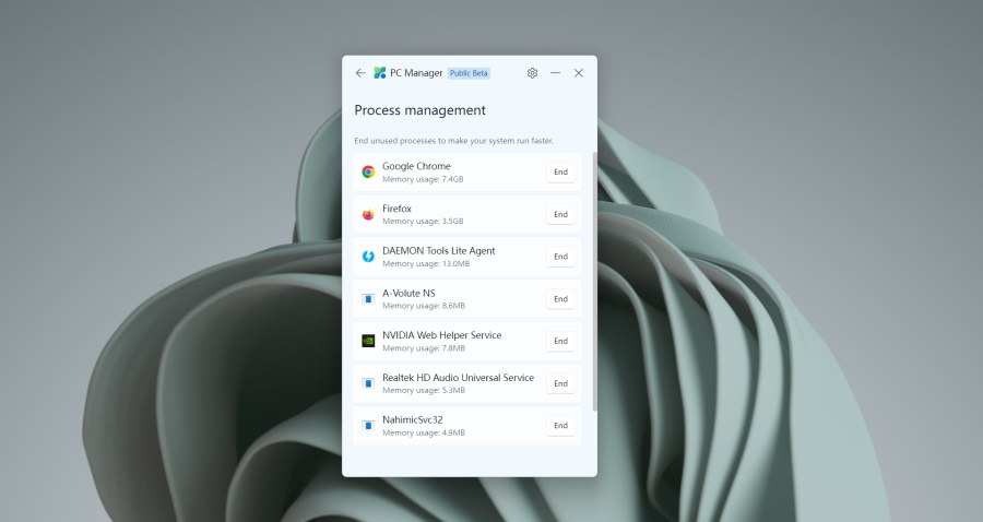 Το PC Manager μπορεί να απενεργοποιήσει εφαρμογές που τρώνε μέσω της μνήμης του υπολογιστή σας. Η επιλογή είναι διαθέσιμη κάτωΔιαχείριση διαδικασιών. Εδώ, ο PC Manager εμφανίζει όλες τις εφαρμογές που καταναλώνουν τη μνήμη εκτελώντας διαδικασίες φόντου.