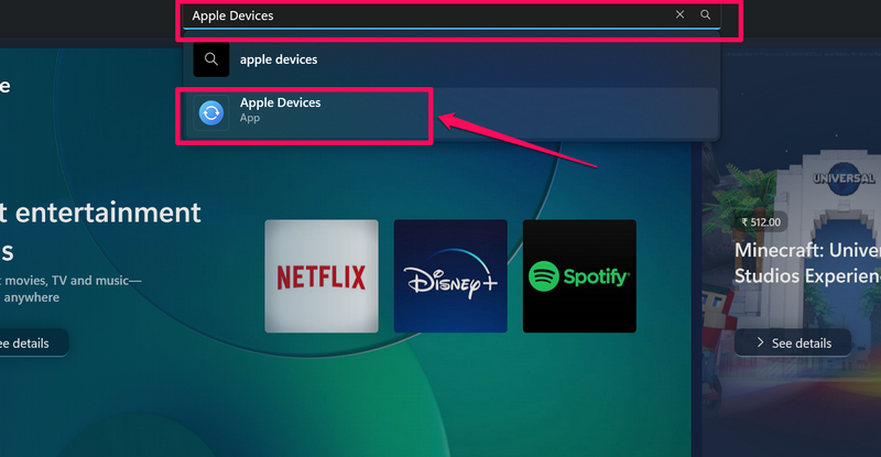 2. Χρησιμοποιήστε τη γραμμή αναζήτησης παραπάνωΓια να βρείτε την εφαρμογή Apple Devices καιΚάντε κλικ στην καταχώρισή τουαπό τα αποτελέσματα αναζήτησης.