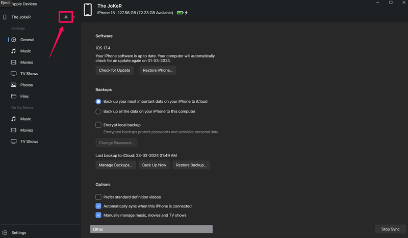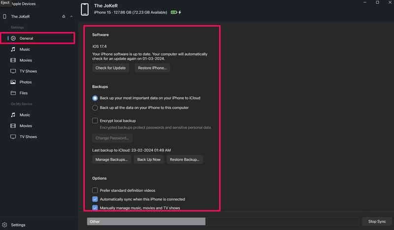 16.Μόλις κάνετε τις προτιμώμενες αλλαγές για το iPhone σας στην εφαρμογή Apple Devices, κάντε κλικ στοΣυγχρονισμόςκουμπί για να τα αποθηκεύσετε.