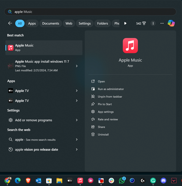 2.Μετά την επανεκκίνηση, χρησιμοποιήστε τα Windows + S για να ανοίξετεΑναζήτηση παραθύρων, βρείτε τοApple Music App,Κάντε κλικ για να ξεκινήσετε.