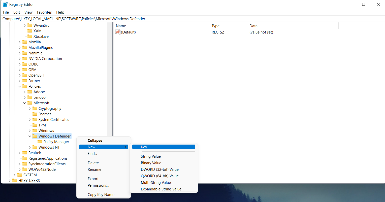- Εάν δεν μπορείτε να βρείτε το κλειδί SmartScreen κάτω από το Windows Defender. Θα πρέπει να το δημιουργήσετε χειροκίνητα. Απλά κάντε δεξί κλικ στο κενό χώρο όταν επιλεγεί ο αμυντικός των Windows.