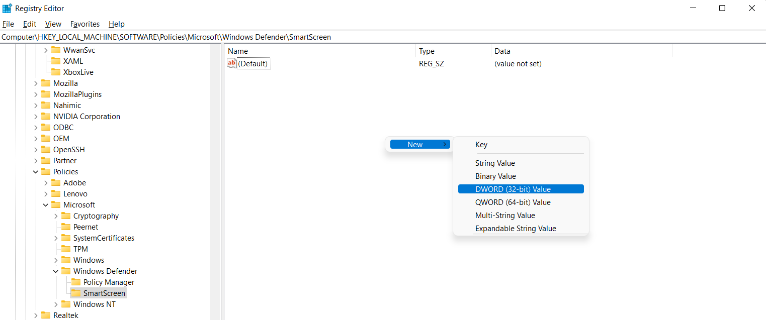 HKEY_LOCAL_MACHINESOFTWAREPoliciesMicrosoftWindows DefenderSmartScreen