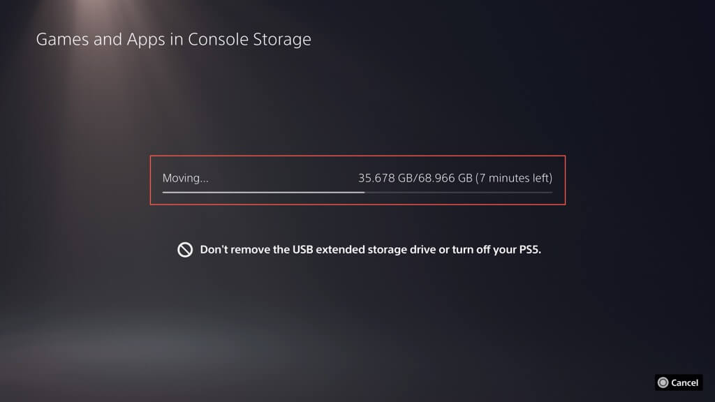 - Περιμένετε έως ότου η κονσόλα μετακινήσει τα παιχνίδια από την εσωτερική της προσπάθεια στην εκτεταμένη αποθήκευση. Θα μπορούσε να διαρκέσει λίγο, ανάλογα με την ταχύτητα γραφής του τελευταίου.