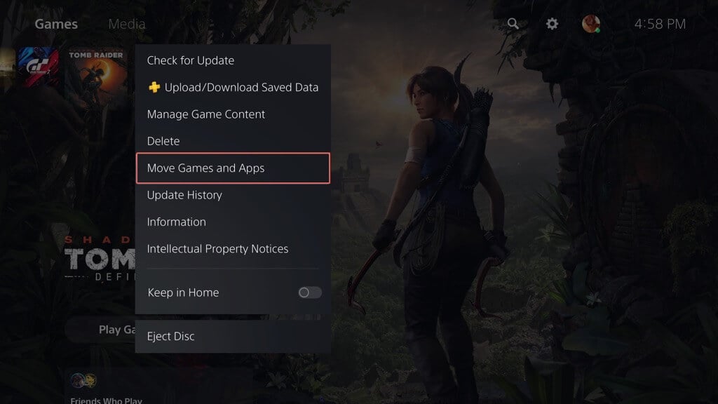 Σε αντίθεση με τα παιχνίδια PS5, μπορείτε να παίξετε παιχνίδια PS4 από την εξωτερική μονάδα αποθήκευσης. Απλώς επιλέξτεΠαιχνίδιΣτην αρχική οθόνη ή στη βιβλιοθήκη παιχνιδιών. Ωστόσο, εάν θέλετε να επωφεληθείτε από την βελτιωμένη ταχύτητα ανάγνωσης της εσωτερικής αποθήκευσης, μπορείτε να τα μετακινήσετε πίσω: