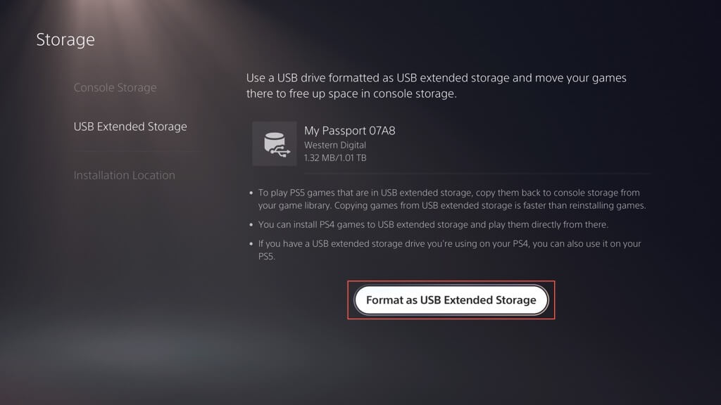 Είναι επίσης απαραίτητο να απελευθερωθείτε η θύρα USB-C Superspeed στο μπροστινό μέρος ή μία από τις θύρες USB-A στο πίσω μέρος της κονσόλας, ανάλογα με το καλώδιο που χρησιμοποιεί η εξωτερική σας μονάδα. Η θύρα USB-A προς τα εμπρός δεν είναι συμβατή με τα εκτεταμένα μέσα αποθήκευσης.