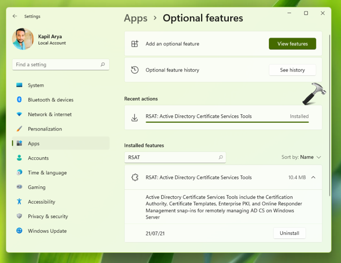 Στα Windows 11, μπορείτε να εγκαταστήσετε RSAT άμεσα χρησιμοποιώντας την εφαρμογή Ρυθμίσεις. Σε αυτό το λειτουργικό σύστημα των Windows, το RSAT είναι διαθέσιμο ως προαιρετικά χαρακτηριστικά. Επομένως, είναι πολύ εύκολο να αποκτήσετε RSAT στα Windows 11 και δεν χρειάζεται να τα κατεβάσετε ξεχωριστά. Σημειώστε ότι δεν μπορείτε να εγκαταστήσετε το RSAT στις εκδόσεις Windows Home. Μπορείτε να ακολουθήσετε παρακάτω αναφερόμενα απλά βήματα για να εγκαταστήσετε το RSAT στα Windows 11.
