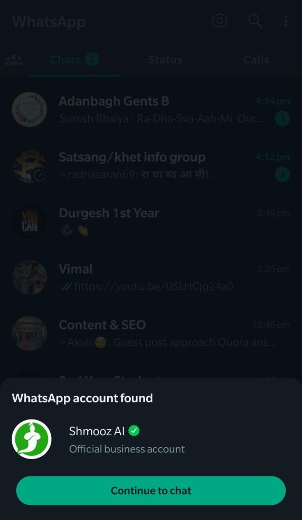 - Τη στιγμή που πατάτε σε αυτό το κουμπί, το WhatsApp θα ξεκινήσει αμέσως, εμφανίζοντας το όνομα"Shmooz ai"Στην κορυφή της διεπαφής.