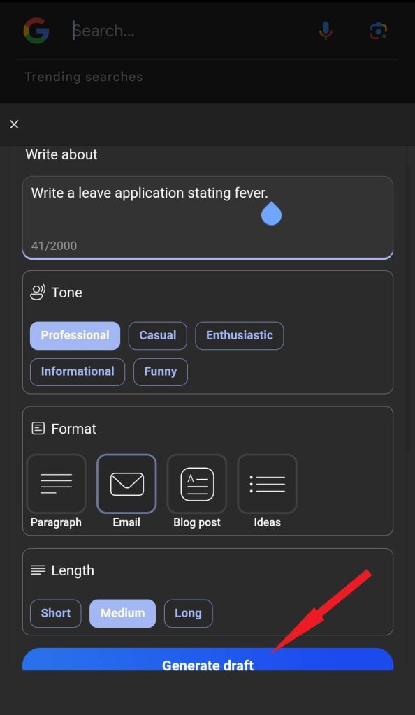 Πατήστε την επιλογή Compose και ζητήστε να γράψετε οτιδήποτε από την επιλογή σας. Με τις επιλογές από τον τόνο, τη μορφή και το μήκος για να διαλέξετε. Τώρα πατήστε στο κουμπί δημιουργίας σχεδίου.