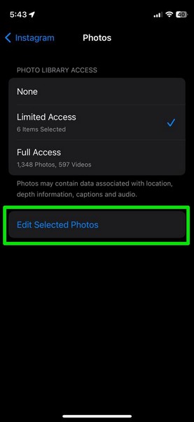 Τώρα, το Instagram ή η εφαρμογή της επιλογής σας θα έχει πρόσβαση μόνο σε αυτές τις εικόνες και βίντεο στην εφαρμογή Φωτογραφιών που έχετε επιλέξει στο iPhone σας. Η πρόσβαση σε άλλες εικόνες και βίντεο στην εφαρμογή Φωτογραφιών θα ακυρωθεί για την εφαρμογή.