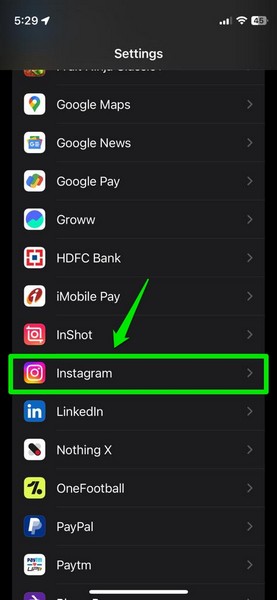 2.Μετακινηθείτε προς τα κάτω καιΕντοπίστε την εφαρμογήΓια τις οποίες θέλετε να περιορίσετε τις φωτογραφίες πρόσβασης στη λίστα και πατήστε την για να ανοίξετε τη σελίδα-settings. Σε αυτή την περίπτωση, πηγαίνουμε με το Instagram, όπως προαναφέρθηκε.