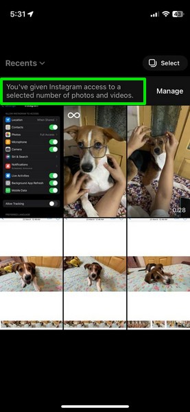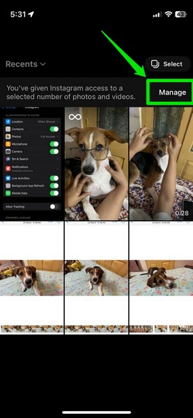 Σε αυτήν την οθόνη, μπορείτε να πατήσετε τοΔιαχειρίζομαικουμπί προςΠροσθέστε περισσότερα αρχεία πολυμέσωνστη λίστα εικόνων και βίντεο που μπορεί να έχει πρόσβαση το Instagram ήΑλλάξτε τη ρύθμιση πρόσβασης φωτογραφιών για το Instagramγια την πλήρη πρόσβαση της εφαρμογής, την οποία συζητήσαμε παρακάτω.