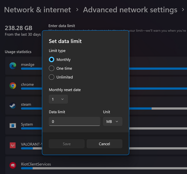 2. Ρυθμίστε το όριο χρήσης δεδομένων στα Windows 11