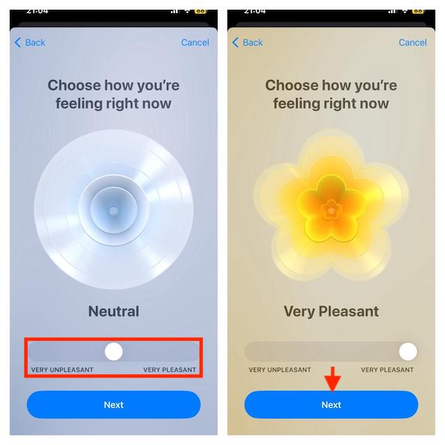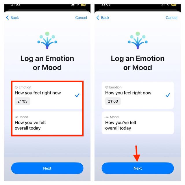 - Τότε, θα σας ζητηθεί να επιλέξετε το δικό σαςΣυγκίνησηήΔιάθεση.Συγκίνηση: Επιλέξτε το συναίσθημα εάν θέλετε να καταγράψετε αυτό που αισθάνεστε τώρα.Διάθεση: Επιλέξτε το αν θέλετε να καταγράψετε αυτό που αισθανθήκατε συνολικά σήμερα. Επιλέξτε οποιαδήποτε από αυτές τις δύο επιλογές και πατήστε στοΕπόμενοςκουμπί.