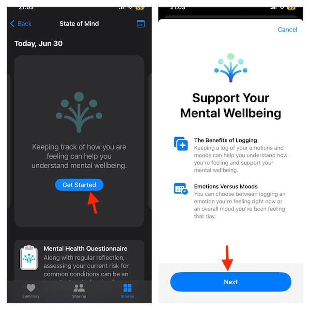 - Εκκινήστε τοΥγείαΕφαρμογή στο iPhone σας ->Περιηγητήςκαρτέλα ->Ψυχική ευημερία->Κατάσταση του νου.