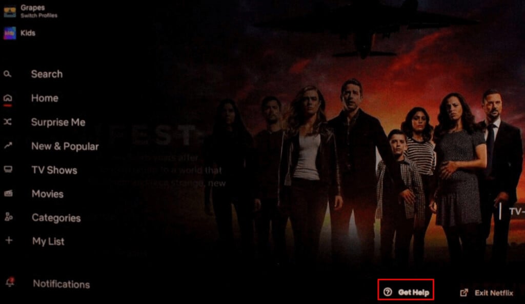 - Στην αρχική οθόνη Netflix, μεταβείτε στην αριστερή πλευρά και επιλέξτεΛάβετε βοήθεια.Χρησιμοποιήστε το τηλεχειριστήριο για να περιηγηθείτε.