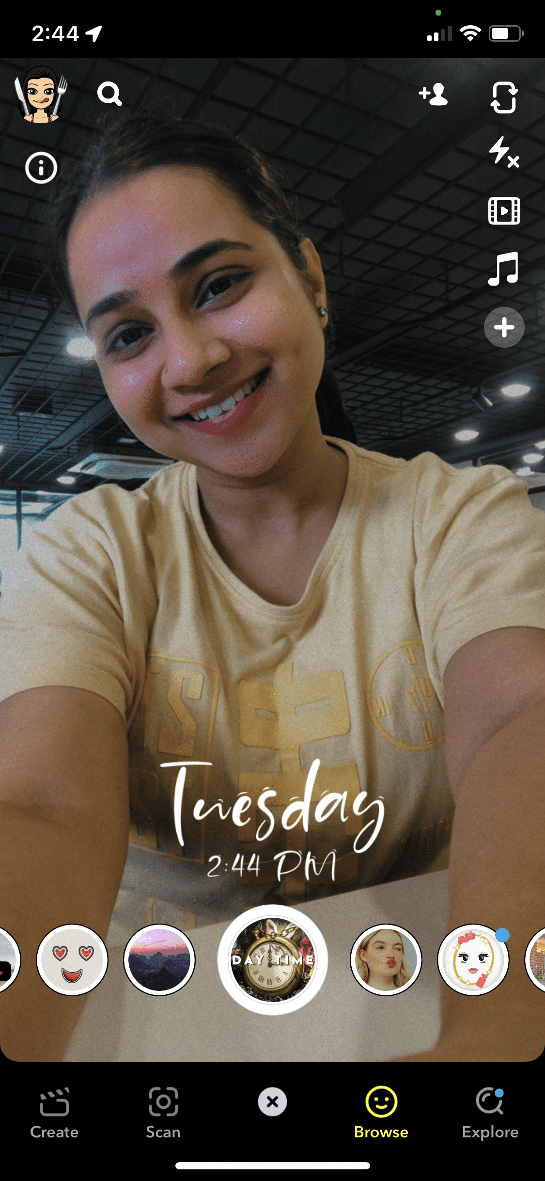 Συνήθως, τα φίλτρα στο Snapchat θα βοηθήσουν να αλλάξετε τον τόνο του δέρματός σας ή να αλλάξετε τη φωνή σας κλπ. Αυτά τα φίλτρα αποτελούνται από πλαίσια και έργα τέχνης που μπορούν να προσθέσουν οι χρήστες ή κατά τη λήψη μέσων. Ωστόσο, τα κανονικά φίλτρα κατηγοριοποιούνται περαιτέρω σε φίλτρα και φακούς. Το πρώτο αποτελείται από αυτοκόλλητα, πολύχρωμες επικαλύψεις, κλπ. Εδώ είναι ένα παράδειγμα φίλτρου Snapchat: