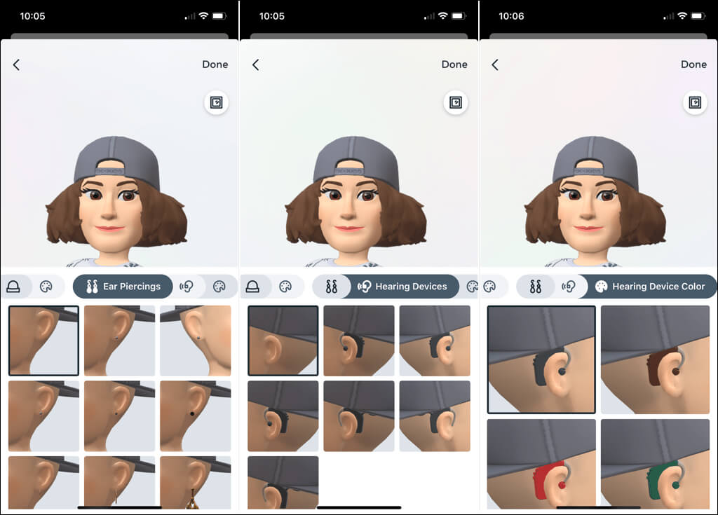 Εάν έχετε τρυπημένα αυτιά, επιλέξτε ένα ζευγάριΤρυπήματα αυτιώνεπόμενος. Για όσους έχουν συσκευή ακρόασης, μπορείτε να επιλέξετε το στυλ και το χρώμα στοΣυσκευές ακοήςκαιΧρώμα συσκευής ακοήςτμήματα.
