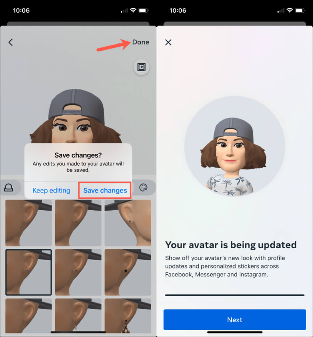 Μόλις ολοκληρώσετε την προσαρμογή του avatar σας, επιλέξτεΓινώμενοςστην επάνω δεξιά γωνία και στη συνέχειαΑποθήκευση αλλαγώνστο αναδυόμενο κουτί. Θα δείτε ένα σύντομο μήνυμα καθώς το avatar σας ενημερώνεται. επιλέγωΕπόμενοςΌταν τελειώσει.
