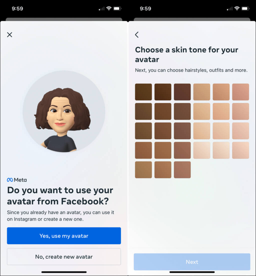 Εάν έχετε συνδεθεί το Instagram και το Facebook, μπορείτε να δείτε ένα μήνυμα που σας ενημερώνει ότι μπορείτε να χρησιμοποιήσετε το avatar σας στο Facebook (αν έχετε ένα) στο Instagram. ΕπιλέγωΝαι, χρησιμοποιήστε το avatar μουΕάν προτιμάτε να χρησιμοποιήσετε μόνο την επιλογή Facebook. Διαφορετικά, επιλέξτεΌχι, δημιουργήστε νέο AvatarΓια να ρυθμίσετε τον μικρό σας εαυτό.
