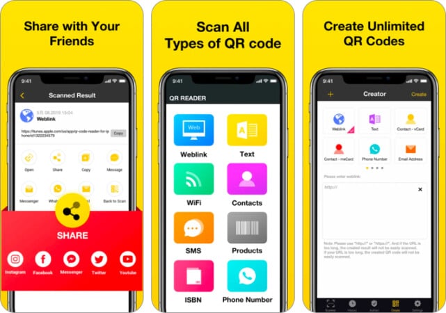 Όπως και άλλες εφαρμογές, σας επιτρέπει να προσθέσετε συνδέσμους στις φωτογραφίες σας, στο PayPal, στο LinkedIn, στο YouTube ή στο App Store και να αποθηκεύσετε όλο το ιστορικό σάρωσης. Η φιλική προς το χρήστη UI και η φωνητική υποστήριξη διευκολύνουν την πρόσβαση. Επίσης, η υποστήριξη iMessage σάς επιτρέπει να μοιράζεστε εύκολα τους κωδικούς QR.