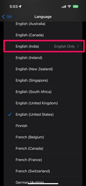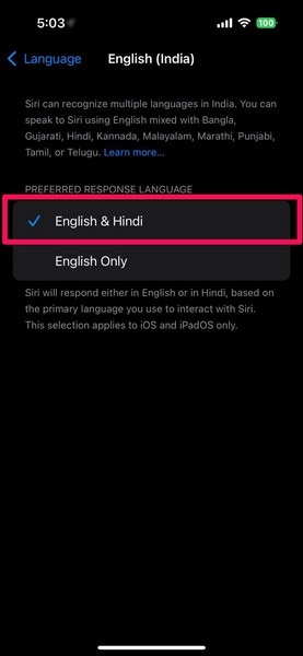 5.Εδώ, πατήστε τοΑγγλικά & Χίντι ΕπιλογήναΟρίστε το ως την κύρια γλώσσα Siriστο iPhone σας.