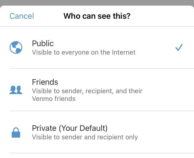 Μπορείτε να επιλέξετε είτε από δημόσια, φίλους ή ιδιωτικά. Το κοινό επιτρέπει σε όλους στο Venmo να δουν τις συναλλαγές σας. Οι φίλοι θα επιτρέψουν μόνο σε εκείνους που είναι φίλοι μαζί σας στο Venmo να τους δουν. Το ιδιωτικό μόνο δείχνει συναλλαγές μεταξύ εσάς και του παραλήπτη. Αυτό θα τεθεί σε ισχύ για κάθε συναλλαγή Venmo που κάνετε από προεπιλογή.