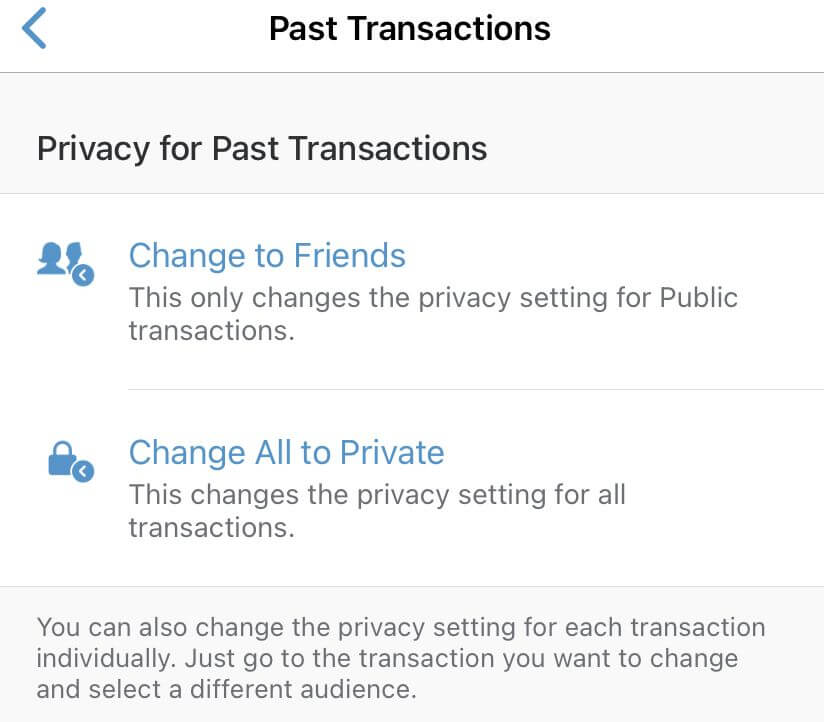 ΕπιλεγμένοςΑλλαγή σε φίλουςθα αλλάξει μόνο τις δημόσιες συναλλαγές. Η αλλαγή όλων σε ιδιωτικό θα αλλάξει κάθε μία από τις συναλλαγές σας. Δεν θα μπορείτε να αλλάξετε τις ιδιωτικές συναλλαγές πίσω στο κοινό ή στους φίλους σας εάν το επιλέξετε.