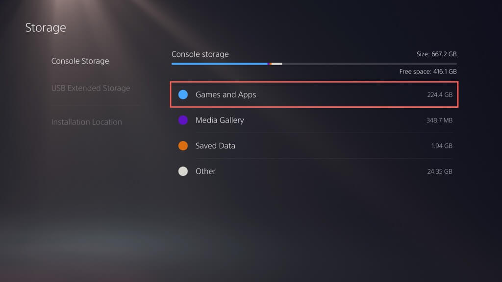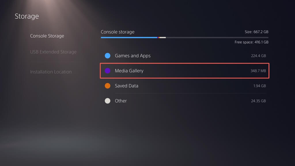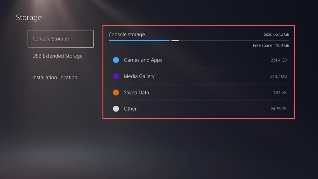 - Ελέγξτε τοΑποθήκευση κονσόλαςΔείκτης για προβολή του μεγέθους του δίσκου και της δωρεάν αποθήκευσης. Αν και το PS5 διαθέτει μονάδα 825GB, κάνει μόνο667.2GBΔιατίθεται μετά τη λογιστική του λογισμικού συστήματος.