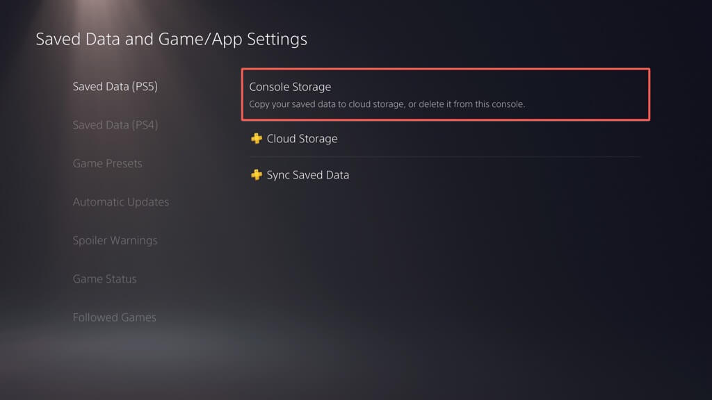 - ΠηγαίνωΑποθηκευμένα δεδομένα (PS5)/Αποθηκευμένα δεδομένα (PS4)>Αποθήκευση κονσόλας.