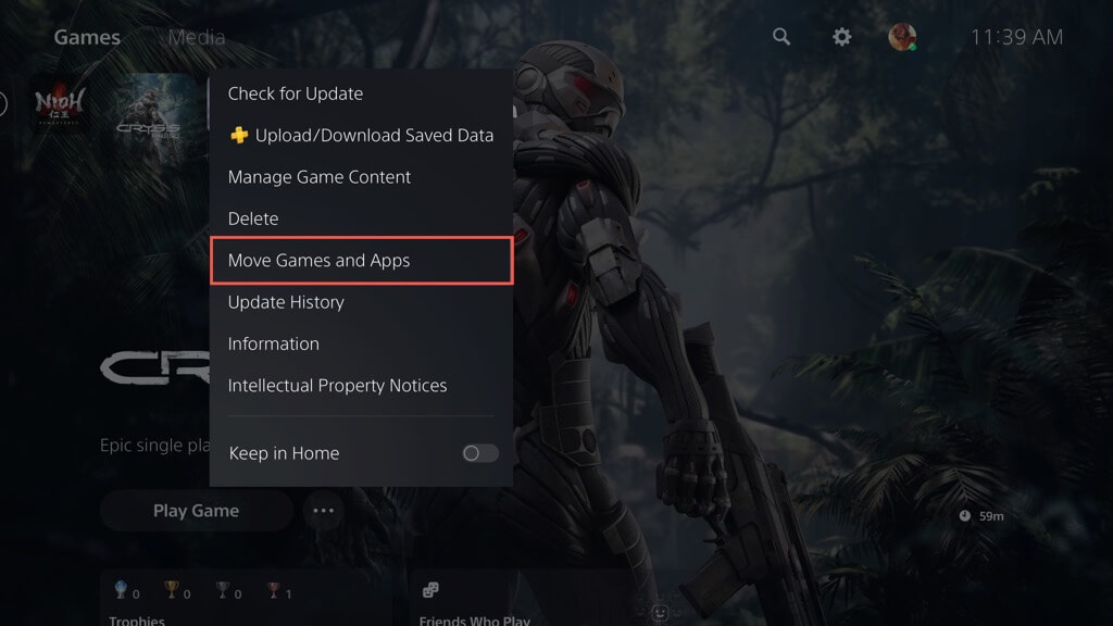 - Επισημάνετε ένα παιχνίδι που θέλετε να προχωρήσετε στην αρχική οθόνη του PS5, πατήστε τοΕπιλογέςκουμπί και επιλέξτεΜετακίνηση παιχνιδιών και εφαρμογών.
