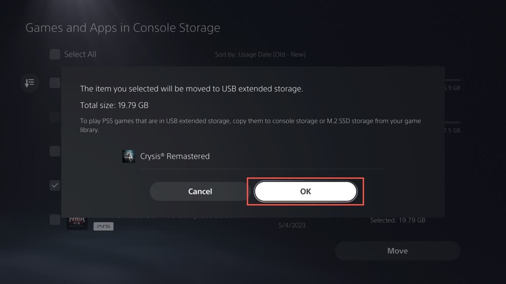 Μπορείτε να παίξετε παιχνίδια PS4 απευθείας από την εκτεταμένη αποθήκευση. Ωστόσο, η αντιγραφή του στην εσωτερική αποθήκευση μπορεί να ενισχύσει τις επιδόσεις και τις ταχύτητες φόρτωσης. Για να το κάνετε αυτό, επισημάνετε το παιχνίδι στην αρχική οθόνη, πατήστεΕπιλογές, και επιλέξτεΜετακίνηση παιχνιδιών και εφαρμογών>Κίνηση.