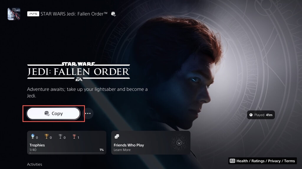 Για να παίξετε ένα μεταφερόμενο παιχνίδι PS5, πρέπει να το αντιγράψετε πίσω στην εσωτερική αποθήκευση. Για να το κάνετε αυτό, επισημάνετε το παιχνίδι στην αρχική οθόνη και επιλέξτεΑντίγραφο.