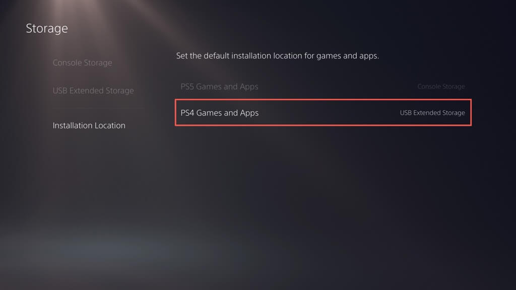 - ΕπιλέγωΤοποθεσία εγκατάστασηςκαι ρυθμίζωΠαιχνίδια και εφαρμογές PS4ναΕπαρχιακή αποθήκευση USB.