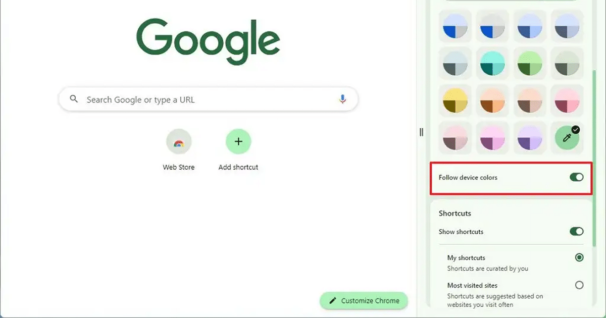 Για να ταιριάζει με το χρώμα προφοράς των Windows 11 στο Google Chrome, πρέπει να έχετε την τελευταία έκδοση του Chrome εγκατεστημένη. Μόλις έχετε την τελευταία έκδοση του Chrome, μπορείτε να ενεργοποιήσετε το διακόπτη "Ακολουθήστε τα χρώματα της συσκευής" στις ρυθμίσεις προσαρμογής Chrome. Αυτό θα προκαλέσει το Chrome να ταιριάζει αυτόματα το χρώμα προφοράς των Windows 11.