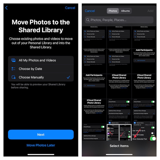 - Επιλέξτε φωτογραφίες με μη αυτόματο τρόπο:Επιλέξτε με μη αυτόματο τρόπο τις φωτογραφίες που θα θέλατε να προσθέσετε στην κοινή βιβλιοθήκη.